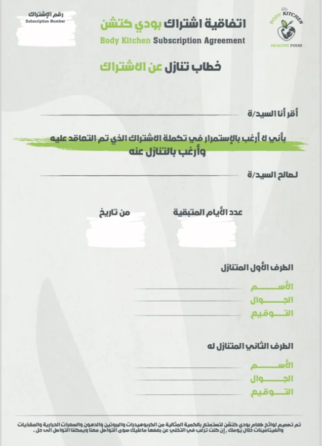 - لايحق للعميل الغاء الاشتراك او التعديل عليه او تغير الباقه او انهاء التعاقد بعد مرور ساعه من الاشتراك ويحق له التنازل عن الاشتراك للعميل اخر وحضور الطرفين للفرع للقيام باجراءات التنازل والتوقيع عليه من كلا الطرفين