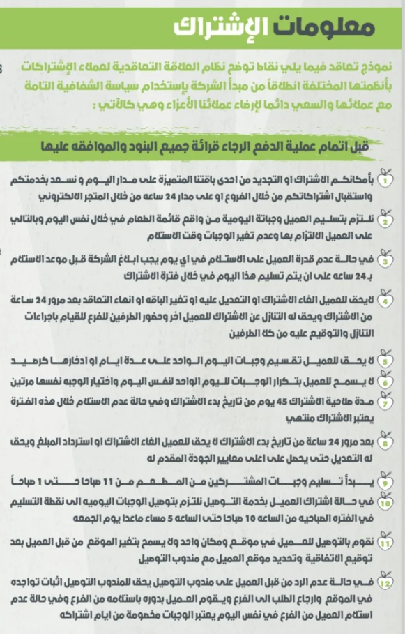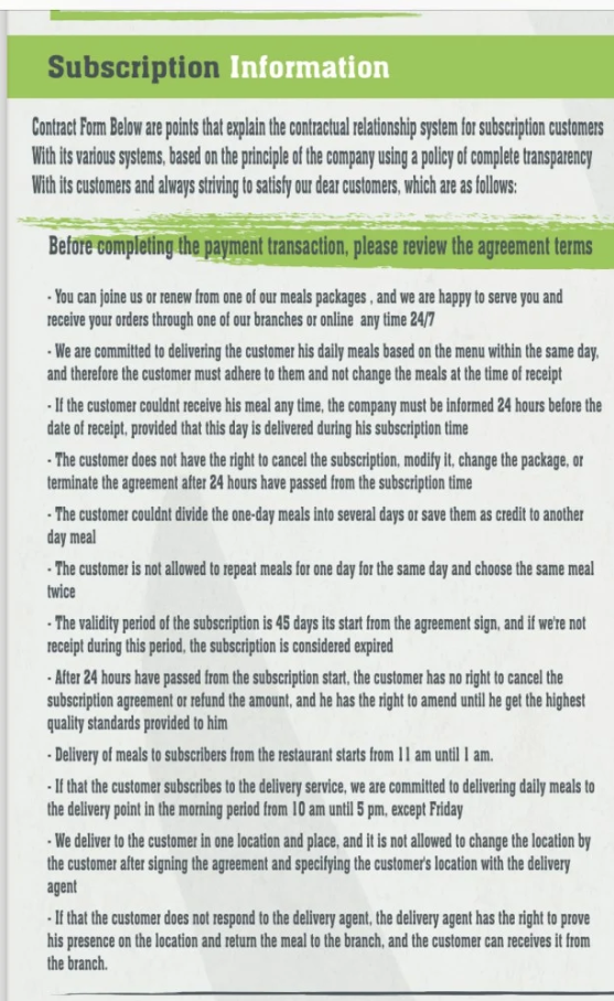- في حالة عدم الرد من قبل العميل على مندوب التوصيل يحق للمندوب التوصيل اثبات تواجده في الموقع وارجاع الطلب الى الفرع ويقوم العميل بدوره باستلامه من الفرع وفي حالة عدم استلام العميل من الفرع في نفس اليوم يعتبر الوجبات مخصومة من ايام اشتراكه